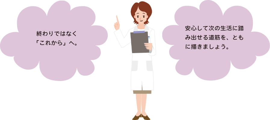 治療の有無にかかわらず、well-being を支える支援がこれからも続いていく、と伝えることが大切です。不安を抱えながら次の一歩を踏み出す気持ちに、伴走しましょう。